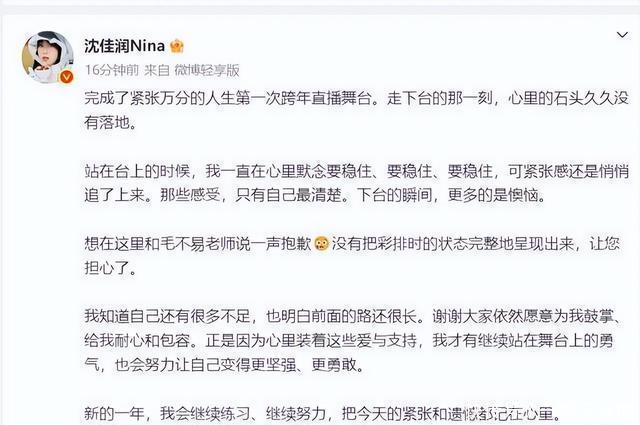 直到跨岁沈佳润岁窦靖童放在一起,才发现两人差别在哪里 比如,在这次江苏跨年演唱会上,她一开口先是抢拍又跑调,站在她身边的毛不易,看出了她的小紧张,连忙牵住她颤抖的手,试图安慰她 事后没多久,沈佳润用自己的社媒发长文道歉,大致的内容是,和毛不易老师说抱歉,没有把彩排时的状态完整呈现出来,她知道自己有不足,也明白前面的路还很长,新的一年继续努力,把这次在舞台上的紧张和遗憾都记在心里